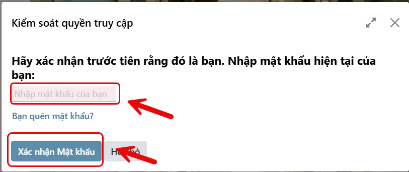 Bước 5: Nhập mật khẩu hiện tại và nhấn xác nhận mật khẩu.